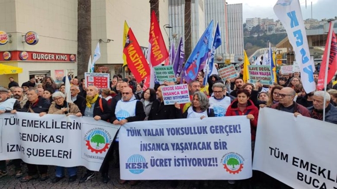Emekçiler ve emekliler TÜİK verilerine ve yapılan düşük zamlara İzmir’den “Artık yeter! İnsanca yaşamak istiyoruz” diyerek tepki gösterdi.