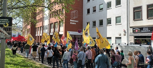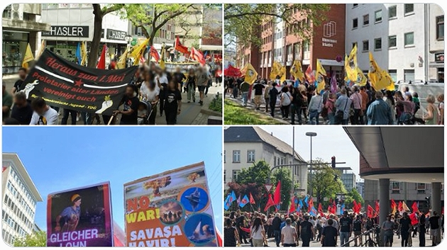 1 Mayıs vesilesiyle kitle saat 10:00’da Mannheim DGB binası önünde toplandı. Sendikanın yanı sıra Alman partilerin, Mannheim ve çevresinde faaliyet gösteren demokratik kitle örgütlerinin çağrısı ile yüzlerce emekçi bir araya geldi ve sendika binası önünde başlayarak şehir merkezine doğru “1 Mayıs kızıldır kızıl kalacak”, “Yaşasın enternasyonal dayanışma”, Faşizme karşı omuz omuza” sloganları eşliğinde yürüyüşe geçti.