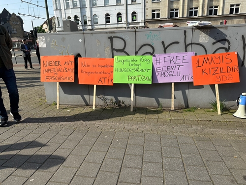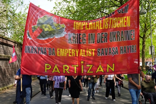 ‘‘Ukrayna’da Emperyalist Savaşa Hayır’‘ Partizan imzalı pankartın taşındığı eylem de korteje yaklaşık 100 kişinin katıldığı gözlemlendi. Eylem de ATİK’in çıkarttığı Almanca bildiriler dağıtıldı ve ATİK, YDG ve Yeni Kadın imzalı, ‘‘Ecevit Piroğlu’na Özgürlük, Free Palestine, Jin Jiyan Azadi, Haksız Savaşlara Hayır, Emperyalist Saldırganlığa Geçit Yok‘‘ sloganlarının yazıldığı dövizler taşındt.