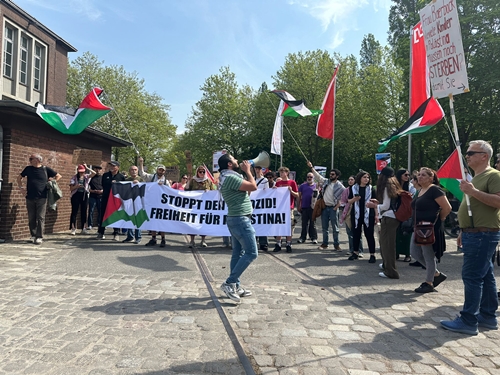 Saat 11:30 kitle valiliğin önünde toplanmaya başladı.  ATİK de,  Partizan ve Sınıf Teorisi’nin ortak oluşturduğu kortej yer aldı. Açılış konuşması yapıldıktan sonra ortak hazırlanman konuşmalar sunuldu. Akabinde kitle yürüyüşe geçti. Yürüyüş boyunda ATİK’in Almanca bildirileri dağıtıldı ve kısa konuşmalar yapıldı. Konuşmalar emperyalizmin saldırıları ve Ortadoğu’daki katliamlara değinildi. Yine Filistin‚de yaşanan katliam anlatıldı. Rojava yönelik bombalanmalara ve emperyalist devletlerin desteklerine değinildi.