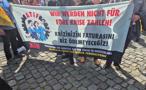 ATİF kitlesinin taşıdığı Almanca ve Türkçe yazılı “Krizin faturasını biz ödemeyeceğiz” pankartı oldukça ilgi gördü. Kitle, attığı “Hoch die internationale Solidarität” ve “Ausrüstung und Waffen, werden keinen Frieden schaffen” gibi güncel sloganlar, katılımcıların beğenisini topladı. Türkiye’de faşizmin her türlü baskısına ve yasaklamalara karşı işçi ve emekçilerin İstanbul Taksim direnişini selamlamak amaçlı “her yer Taksim, her yer direniş” sloganı atıldı. Coşkulu bir şekilde söylenen marşlar eşliğinde, yürüyüş Deutsches Eck meydanında sona erdi.
