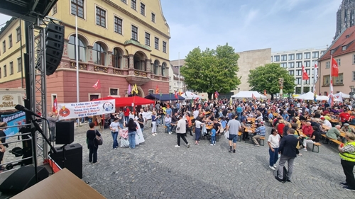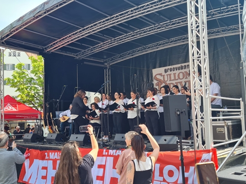 En başta Bündnis Gemeinsam für Vielfalt und Demokratie (Çeşitlilik ve Demokrasi için Birlikte) adlı oluşumun pankartının yer aldığı, şehir içinde yapılan uzun yürüyüşten sonra, yine başlangıç noktası olan DGB Sendika Binası önünde, Weinhof meydanında miting gerçekleştirildi. Mitingte, konuşmalar ve müzik programı gerçekleştirildi. Alevi Kültür Merkezi ve Cemevi (AKM) Ulm’un müzik korosu büyük ilgi gördü. Koronun seslendirdiği özellikle 1 Mayıs Marşına ve Çav Bella (Bella Ciao) şarkısına tüm kitle eşlik etti.