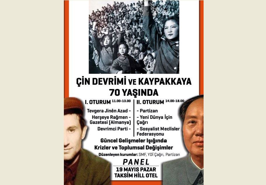 Çin demokratik halk devriminin ve komünist önder İbrahim Kaypakkaya’nın 70 yaşında olması vesilesi ile Partizan, Sosyalist Meclisler Federasyonu (SMF), Yeni Dünya İçin Çağrı Çin devrimi ve Kaypakkaya konulu panel düzenleyeceklerini duyurdu.
