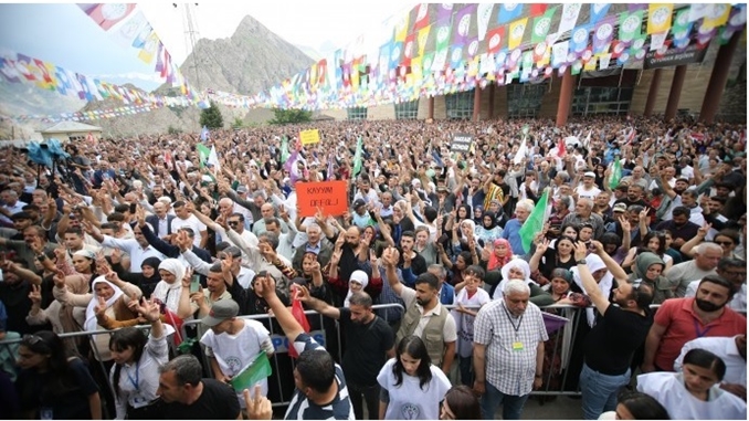 Miting alanını hınca hınç dolduran on binlerce kişi, sık sık “Bijî Serok Apo”, “Colemêrg ya me ye”, “Bijî berwxedana Colemêrgê” ve “Bijî berxwedana zindanan” sloganları atarak, halaya durdu. Kürdistan ve Türkiye’den gelen kitle, kendi yörelerine ait elbiselerle mitinge katıldı. Miting alanından kayyıma karşı da sık sık sloganlar yükseldi.