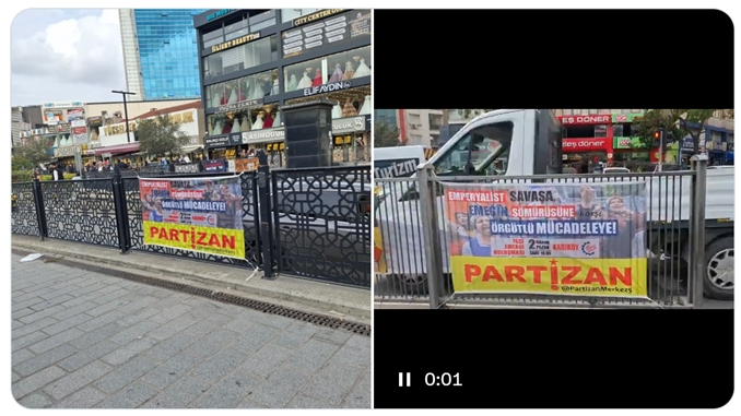 Partizan, X Hesabı’ndan (@PartizanMerkez5) yaptığı paylaşımda; “Emperyalist Savaşa ve Emeğin Sömürüsüne karşı Örgütlü Mücadeleye! Emperyalist üslerin kapatılması ve haksız savaşlara dur demek için… Kadıköy’de İşçi-Emekçi Buluşması’ndayız!