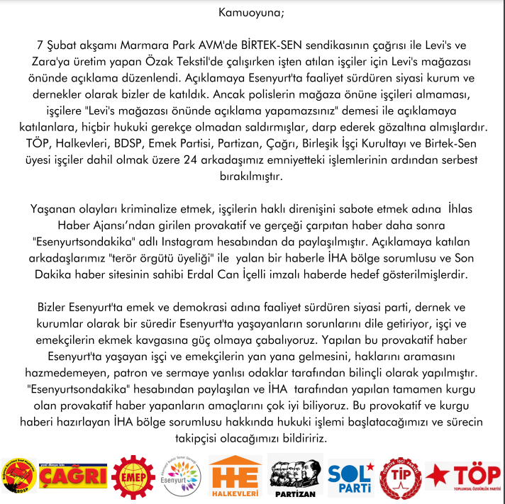 TÖP, Halkevleri, BDSP, Emek Partisi, Partizan, Yeni Dünya İçin Çağrı, Birleşik İşçi Kurultayı ve Birtek-Sen üyesi işçiler dahil olmak üzere 24 arkadaşımız emniyetteki işlemlerinin ardından serbest bırakılmıştır. Yaşanan olayları kriminalize etmek, işçilerin haklı direnişini sabote etmek adına İhlas Haber Ajansı’ndan girilen provakatif ve gerçeği çarpıtan haber daha sonra “Esenyurtsondakika” adlı Instagram hesabından da paylaşılmıştır. Açıklamaya katılan arkadaşlarımız “terör örgütü üyeliği” ile yalan bir haberle İHA bölge sorumlusu ve Son Dakika haber sitesinin sahibi Erdal Can İçelli imzalı haberde hedef gösterilmişlerdir.