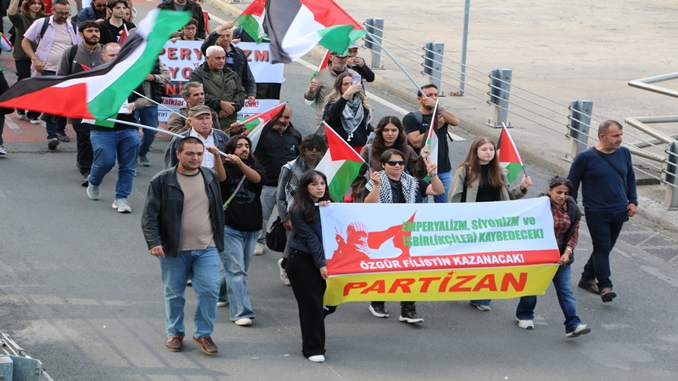 Atatürk Kültür Merkezi önünde başlayan yürüyüşte sık sık “Yaşasın nehirden denize özgür Filistin!”, “Katil İsrail Filistin’den defol!” ve “Katil ABD, işbirlikçi AKP!” sloganları atıldı.