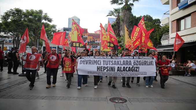 Yerel seçim sürecinin ardından Van eylemleri ile başlayan, 1 Mayıs’ta Taksim’e yürüme iradesi karşısında yoğunlaşan ve İbrahim Kaypakkaya ve Mayıs şehitlerini anma eylemiyle devam eden gözaltı ve tutuklama terörü, İzmir’de ilerici-devrimci kurumlar tarafından gerçekleştirilen bir eylemle protesto edildi.