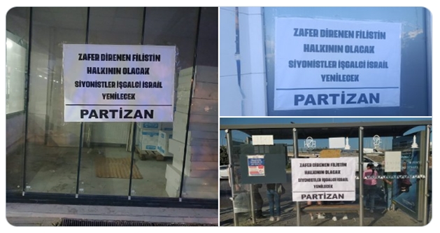 İzmir’de merkezi yerlere ve otobüs duraklarına “Zafer Direnen Filistin Halkının Olacak, Siyonist İşgalci İsrail Yenilecek! Partizan imzalı ozalitler asan İzmir Partizan X Hesabı’nda yaptığı paylaşımda; “Filistin’de siyonist işgalci İsrail ve Emperyalistlerin yaptığı katliam ve soykırıma karşı direnen Filistin halkının, haklı mücadelesi mücadelemizdir. İşgalciler ve Emperyalistler yenilecek direnen halklar kazanacak!” ifadelerini kullandı.