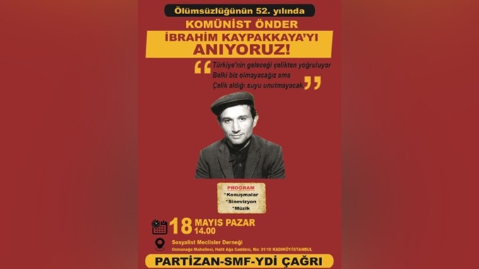 Partizan, Sosyalist Meclisler Federasyonu (SMF) ve Yeni Dünya İçin Çağrı (YDİ Çağrı), 68 gençlik hareketi ve 71 devrimci çıkışının komünist önderi İbrahim Kaypakkaya’yı katledilişinin 52. yılında anmak için bir araya geliyor. Anma, 18 Mayıs Pazar günü saat 14.00’te Kadıköy’de bulunan Sosyalist Meclisler Derneği’nde gerçekleştirilecek.