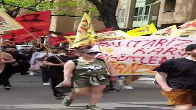 Yürüyüş boyunca, “Birlik Mücadele Zafer”, “1 Mayıs Kızıldır Kızıl Kalacak “, “Jin jiyan azadi” “Faşizme karşı omuz omuza ” “Önderimiz İbrahim, İbrahim Kaypakkaya “vb sloganlar atıldı.
