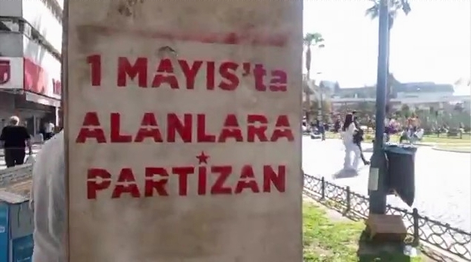 Şehrin işlek caddelerine şablon ve spreyle “1 Mayıs’ta Alanlara Partizan” yazılamaları gerçekleştiren Partizan sanal medya hesabından yaptığı paylaşımda; “Esnek ve güvencesiz çalışmaya, sendikasızlaştırma saldırılarına karşı sınıfın biriktirdiği sinerjiyle 1 Mayıs’a! Kayyum Mehmet Şimşek’in OVP’sine, dolaylı ve doğrudan vergilerle sömürüye dur demek, sınıfın iktidarına yürümek için 1 Mayıs’a! Birliğe ve direnişe!” ifadelerini kullandı.