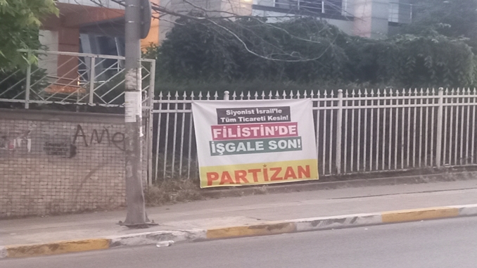 AKP-MHP iktidarı, bir yandan Siyonist İsrail’le başta petrol olmak üzere her türlü ticareti sürdürürken diğer yandan Filistin halkının katledilmesine yönelik yaptığı “kınama” açıklamalarına dair Partizan “Siyonist İsrail’le tüm ticareti kesin! Filistin’de İşgale son! Partizan” içerikli pankart astı.