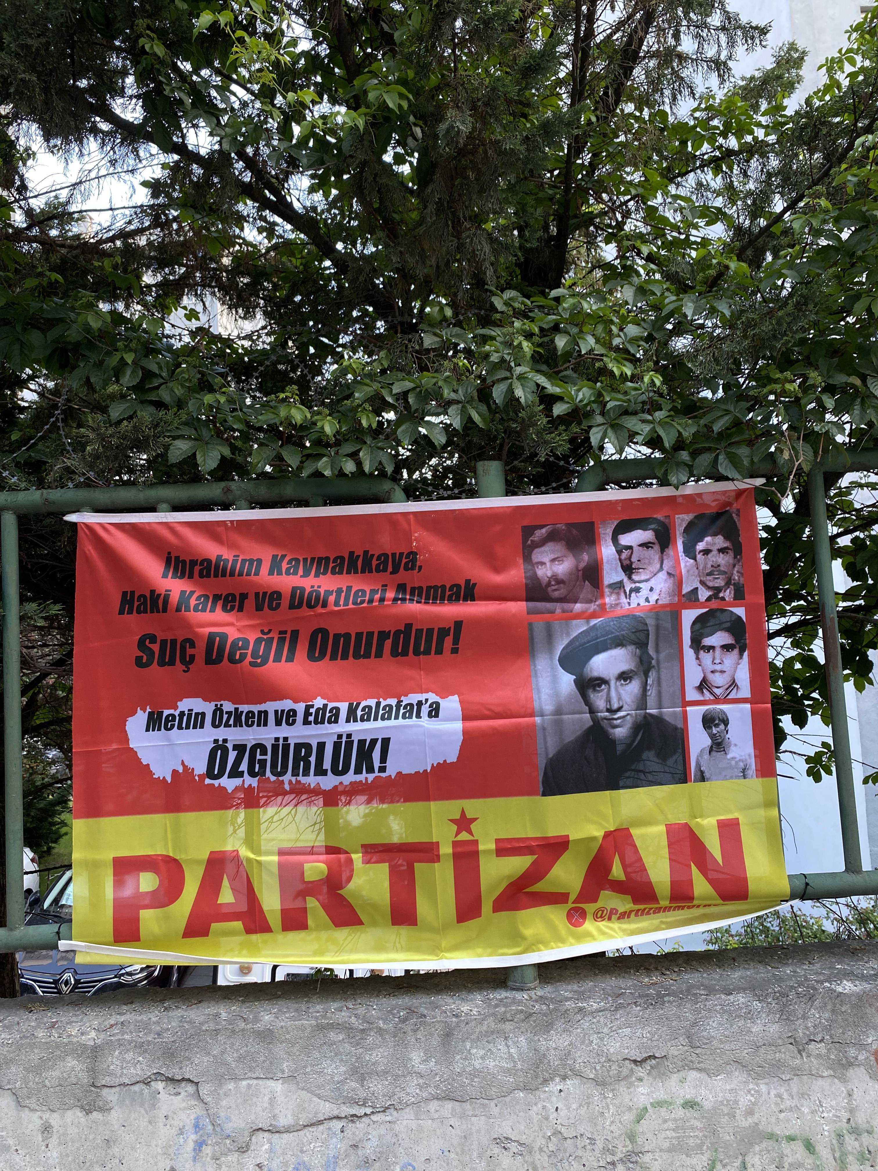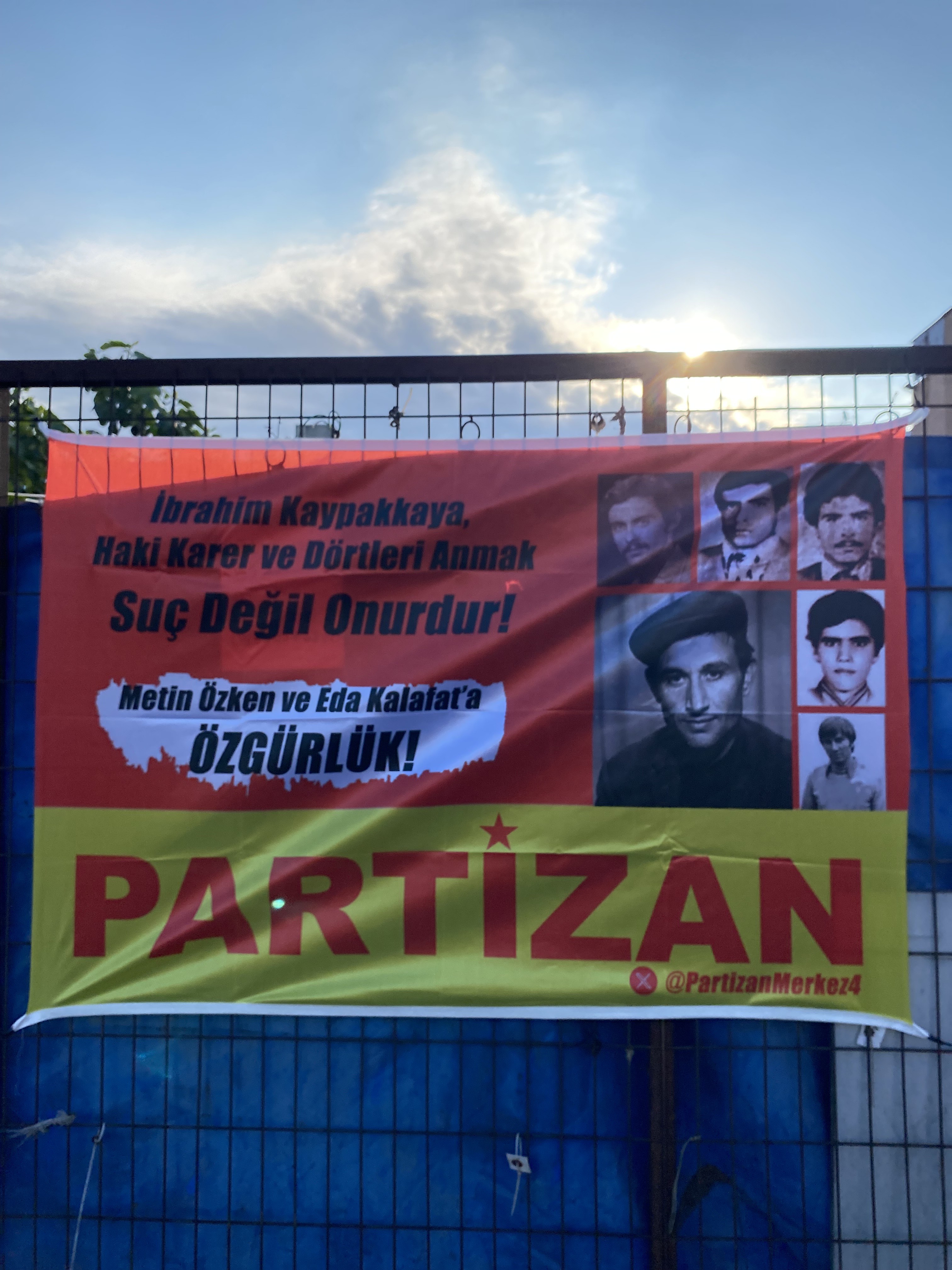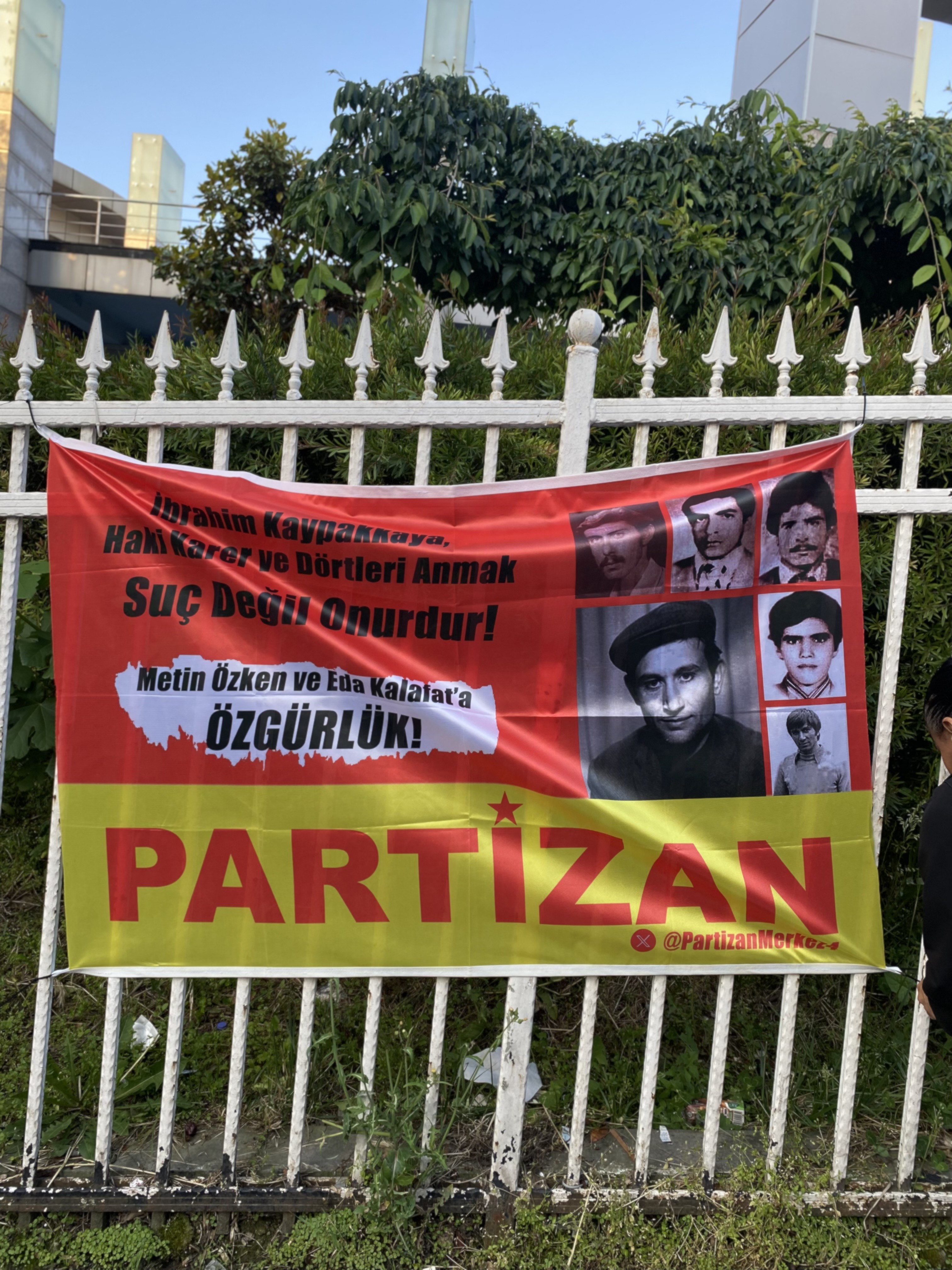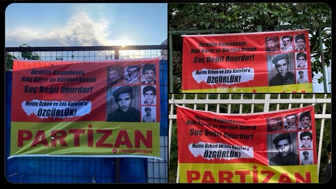 Yaşanan tutuklamalara tepki gösteren Partizan Metin ve Eda ile dayanışmak amacıyla pankart astı.