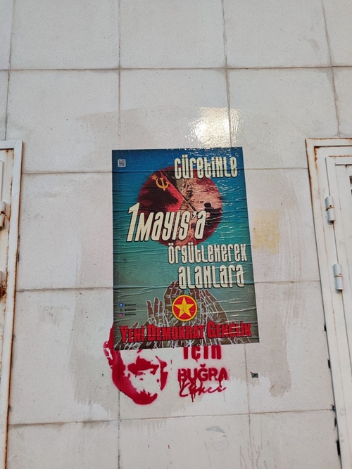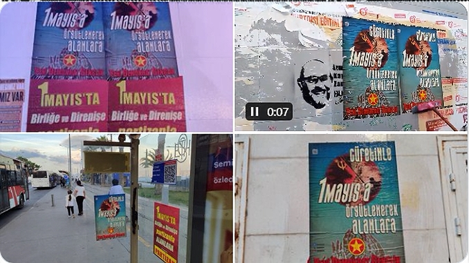 İzmir Karşıyaka’da otobüs duraklarına ve duvarlara; Partizan imzalı “1 Mayıs’ta Birliğe ve Direnişe Partizanla Alanlara” ile YDG imzalı “Cüretinle 1 Mayıs’a Örgütlenerek Alanlara” afişleri yapıldı.