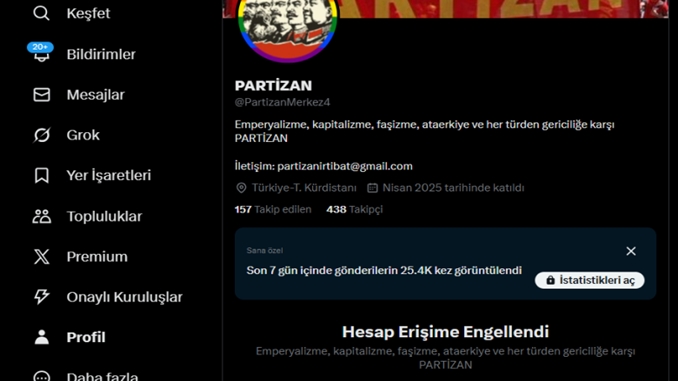 Yakın zamanda X hesabı @PartizanMerkez3 kapatılan Partizan’ın bu defa da yeni X hesabı @PartizanMerkez4 erişime engellendi.