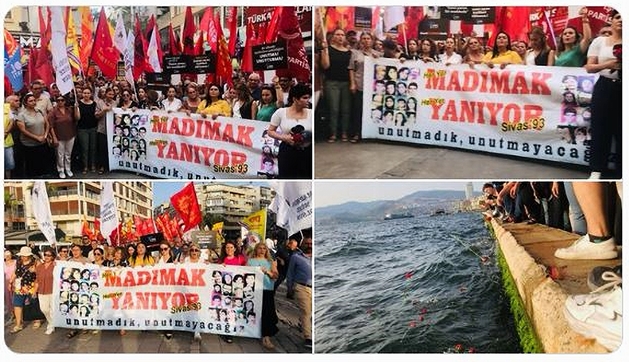 Anma açıklamanın ardından sloganlarla Gündoğdu Meydanına yapılan yürüyüşle devam etti. Burada son olarak Sivas’ta 31 yıl önce katledilen 33 can anısına denize bırakılan karanfillerle anma etkinliği bitirildi.