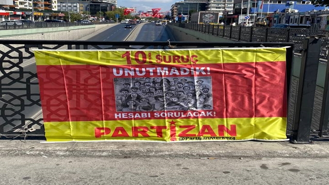 Partizan İstanbul’da Suruç için pankart astığını duyurdu. “10. Yıl Unutmadık! Hesabı Sorulacak! Partizan” imzalı pankart bir üst geçide asıldı.